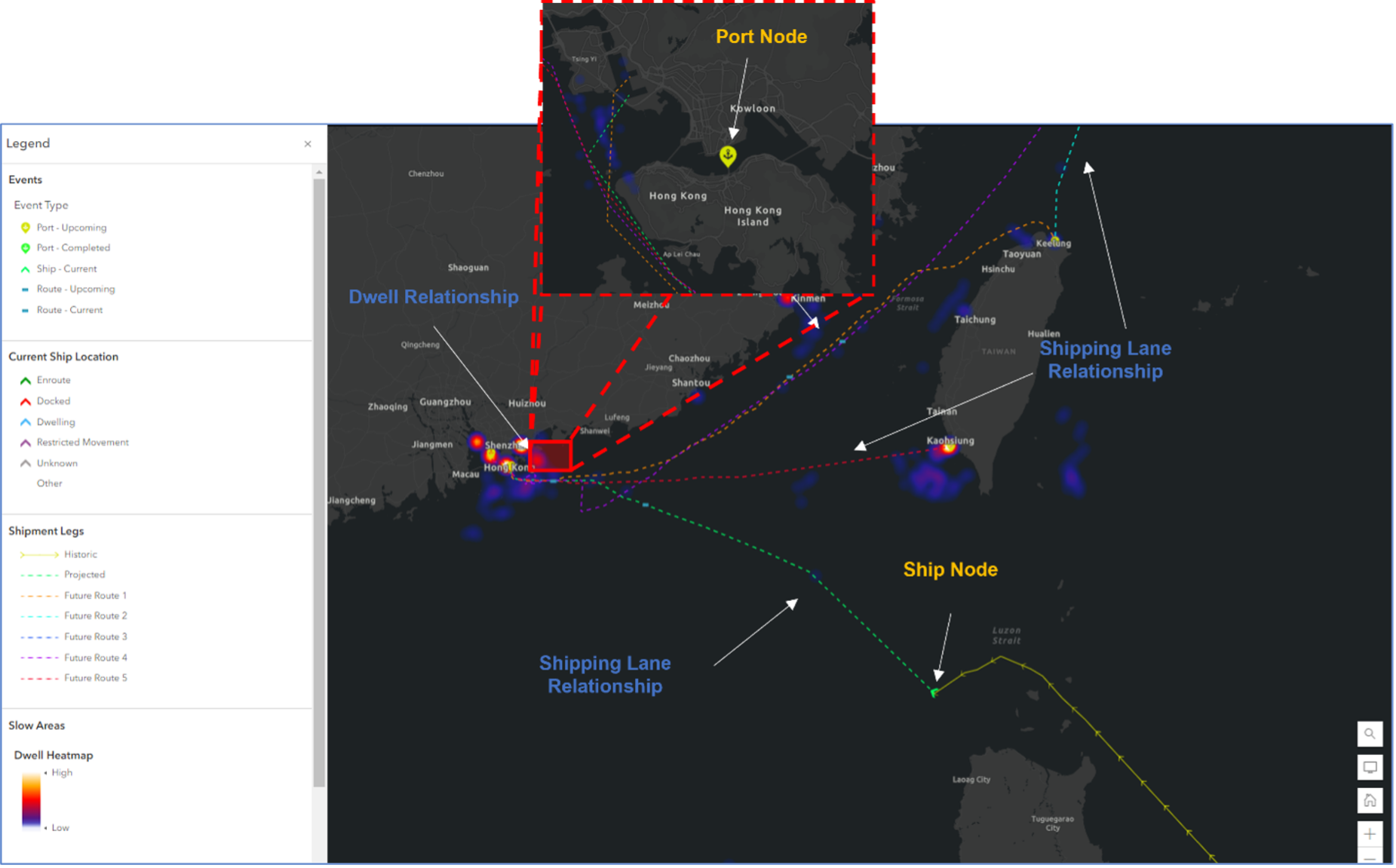 Take, for example, a cargo vessel traveling across the ocean. We can define a cargo vessel as a ship node that typically interacts with a port node. The relationship that connects the two can be defined with how they interact. At a macro level, the relationship can be defined as a shipping lane, because this defines at a macro level how ships interact with ports.
