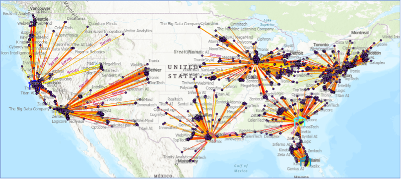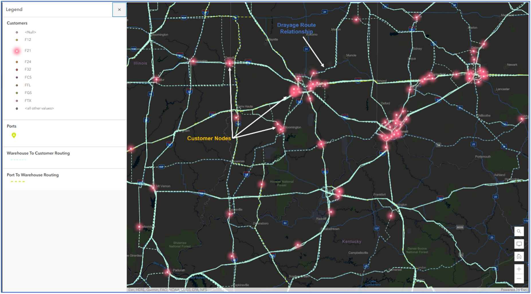 Figure 4 – Leveraging spatial technology gives us a unique view into how our supply chain is laid out geographically. In this figure, we perform a hotspot analysis on our customer nodes, analyzing our most and least densely populated regions where our customers are located.